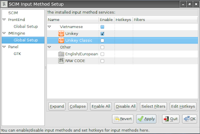 Để sử dụng Scim-Unikey với SCIM. Trong Menu chọn Tools, rồi chọn SCIM Input Methol Setup, hoặc trong Menu chọn Run, rồi gõ scim-setup cũng được:
